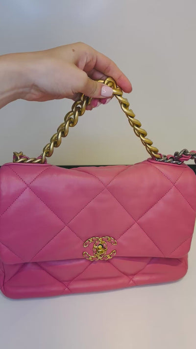 A Chanel 19 é uma das bolsas mais desejadas da maison francesa, conhecida por seu design moderno, acabamento impecável e toque despojado de sofisticação. Em sua versão grande e rosa, ela une a ousadia das cores vibrantes ao luxo atemporal da Chanel, criando um acessório único e cheio de personalidade.
