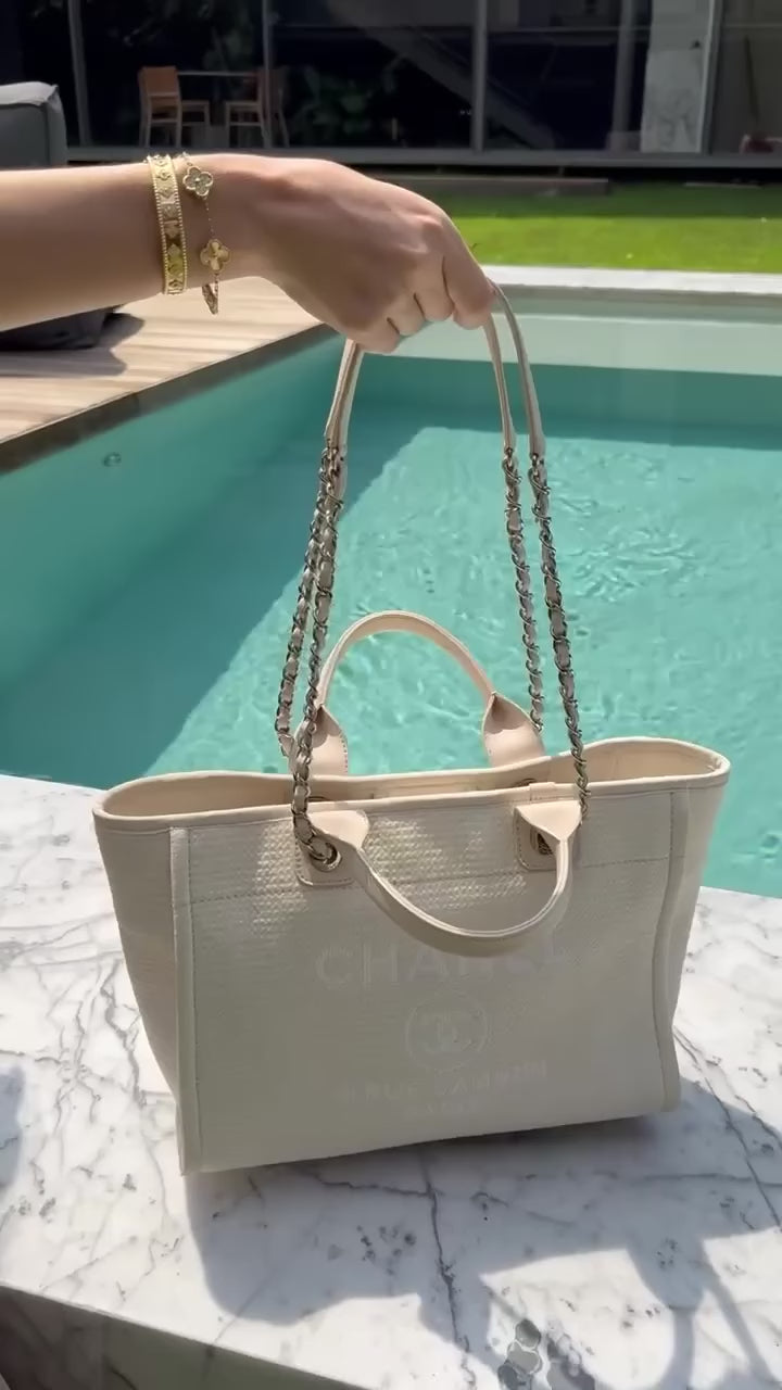 A Chanel Deauville é o modelo perfeito para unir sofisticação e praticidade em momentos de lazer. Em tom off-white, ela traz leveza e elegância, ideal para compor produções de verão com charme e exclusividade.