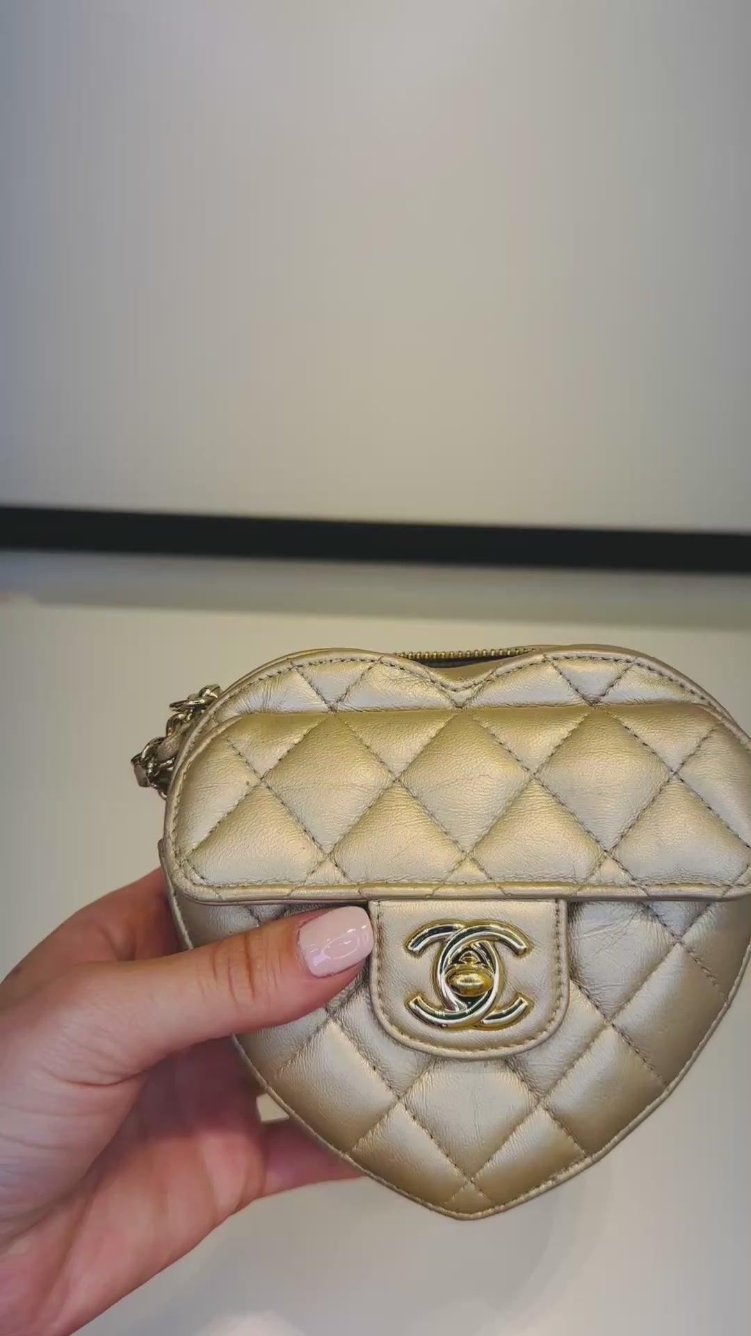 Charmosa e exclusiva, a Chanel Mini em formato de coração é um verdadeiro objeto de desejo. Em dourado, ela combina romantismo e luxo em uma peça única que transforma qualquer look em destaque absoluto.