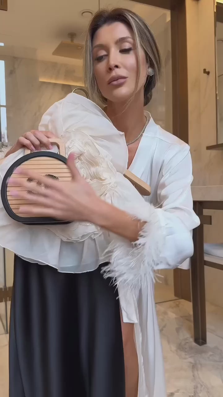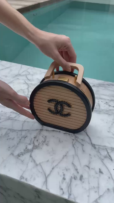Peça única e sofisticada, a Chanel Wood combina a elegância da maison francesa com materiais distintos: estrutura em madeira e acabamentos em couro preto, criando um acessório moderno e icônico.