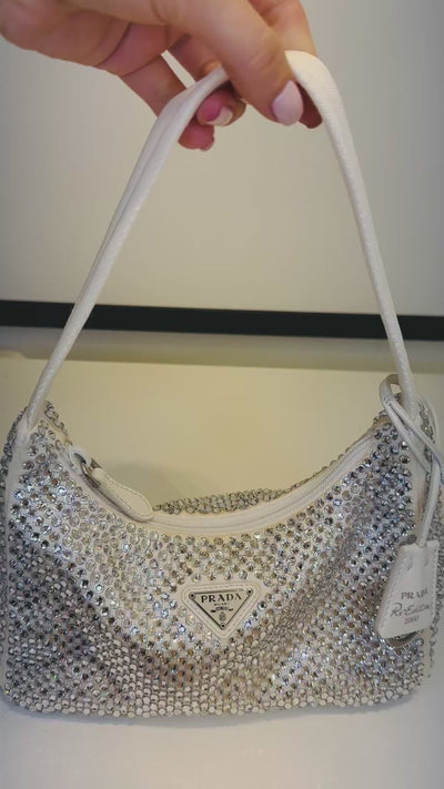 Brilho e sofisticação definem a Prada Re-Edition Cristais, na combinação elegante de prata com branco. Totalmente cravejada, une design icônico da maison com glamour moderno, tornando-a uma peça de destaque em qualquer produção.