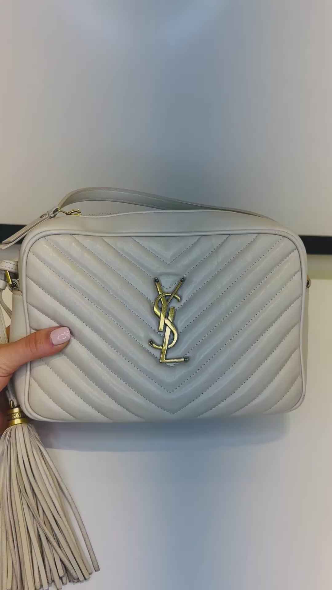 Moderna e sofisticada, a YSL Camera Off-White combina elegância atemporal com detalhes marcantes: ferragens douradas e delicadas franjas que acrescentam movimento e personalidade à peça.